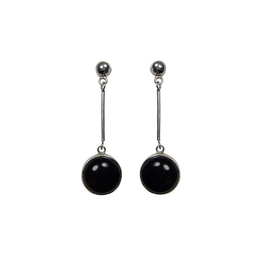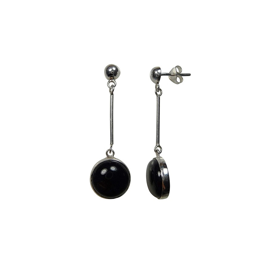 Clous d'oreilles pendants en argent et agates noires rondes.