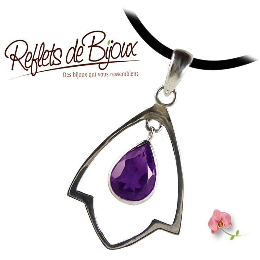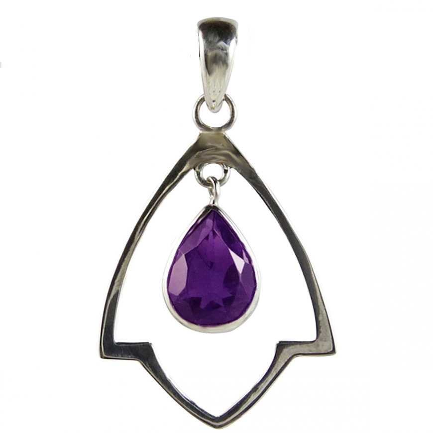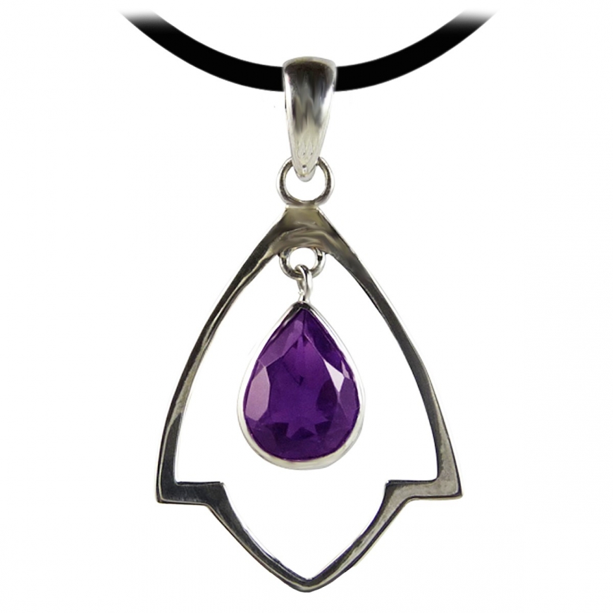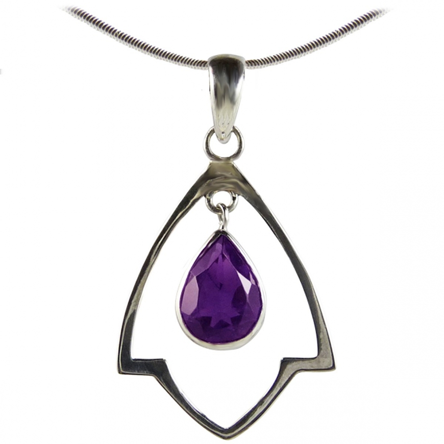 Pendentif de forme moderne qui met en valeur une jolie larme d'améthyste suspendue dans le vide délimité par un fin liseré d'argent. Joli pendentif épuré fin et moderne en améthyste pierre mauve ou violette