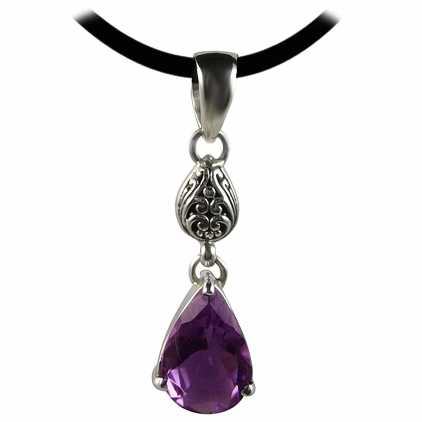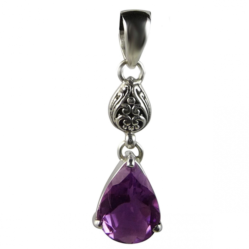 Pendentif ethnique avec une belle pierre d'améthyste violette facettée et griffée, au dessus une poire en argent finement travailléet et une belière joliment travaillée. Ce pendentif est articulé ou mobile en trois parties avec un style moderne