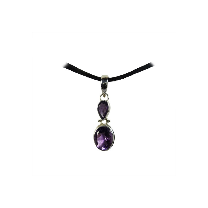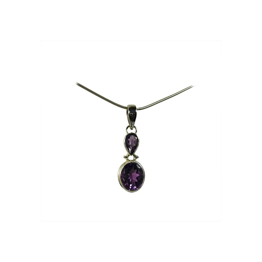 Pendentif en double améthyste de couleur violette constitué de deux formes différentes, larme et ovale, suspendues l'une à l'autre. Bijoux scintillant et lumineux.
