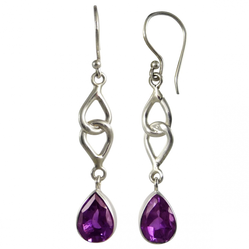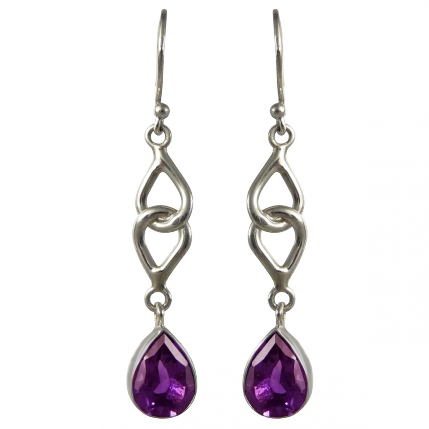 Boucles d'oreilles fines et originales, ces boucles représentent le dessin ou motif infini (infinity) le motif est façonné en long et une goutte d'améthyste vient se positionner dessous la pierre est griffée. En argent 925, Finement dessinées et mobiles ces boucles sont adorables! Fermoir à crochets avec bouchon silicone