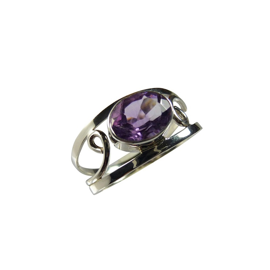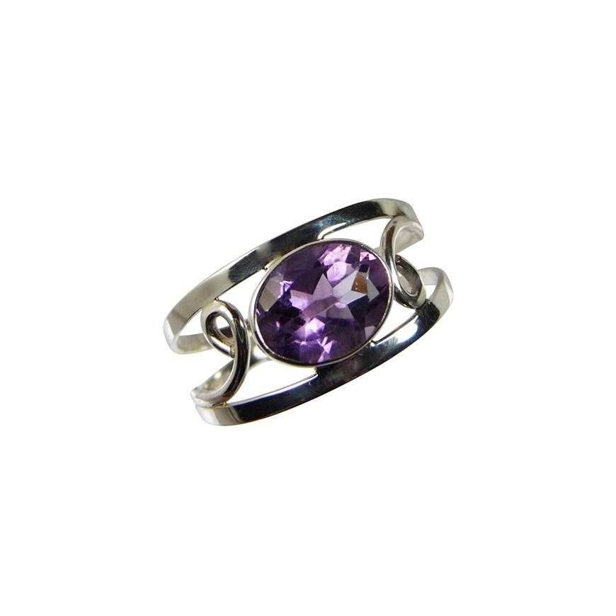 Cette bague en argent à une monture ajourée et porte une belle améthyste ovale et translucide, elle est sertie dans un tour d'argent lisse. La pierre est posée à l'horizontale sur le doigt, elle est gracieuse et élégante.