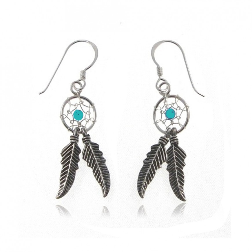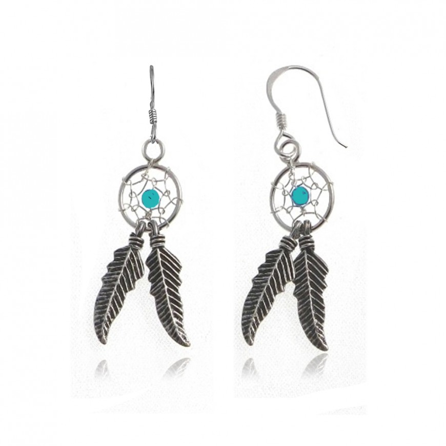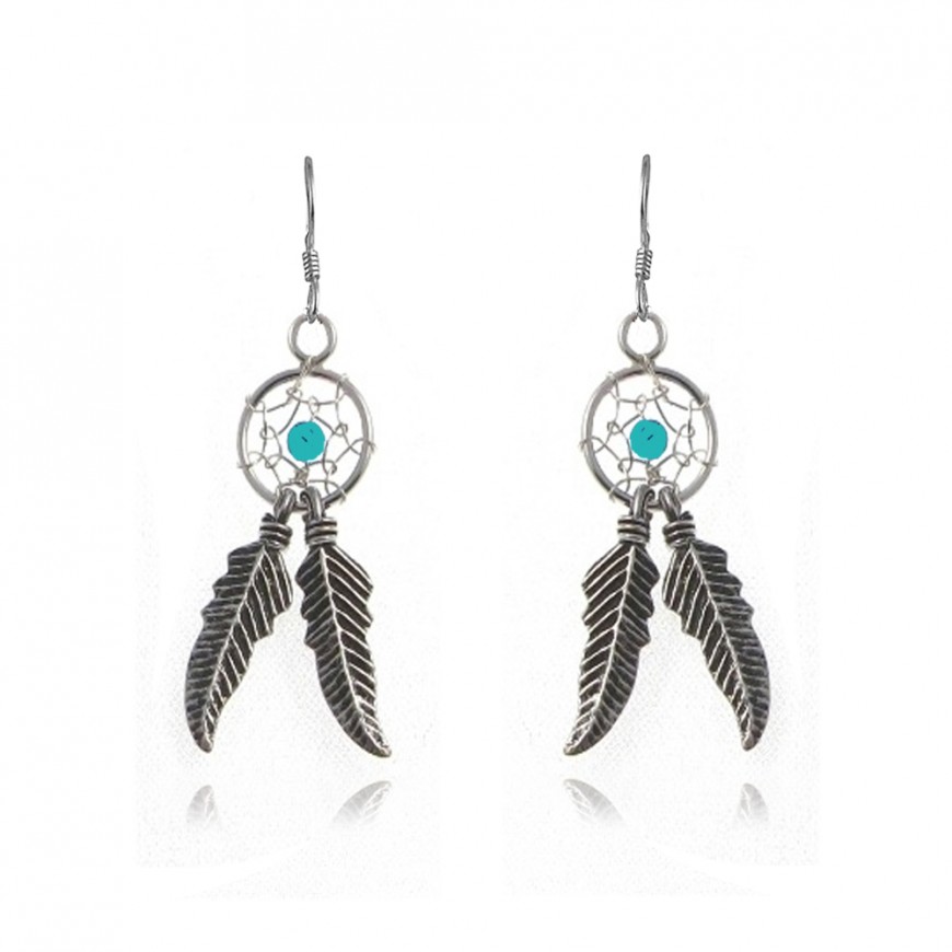 Boucles d'oreilles Dreamcatcher avec perle turquoise au centre, ces boucles disposent de deux feuilles