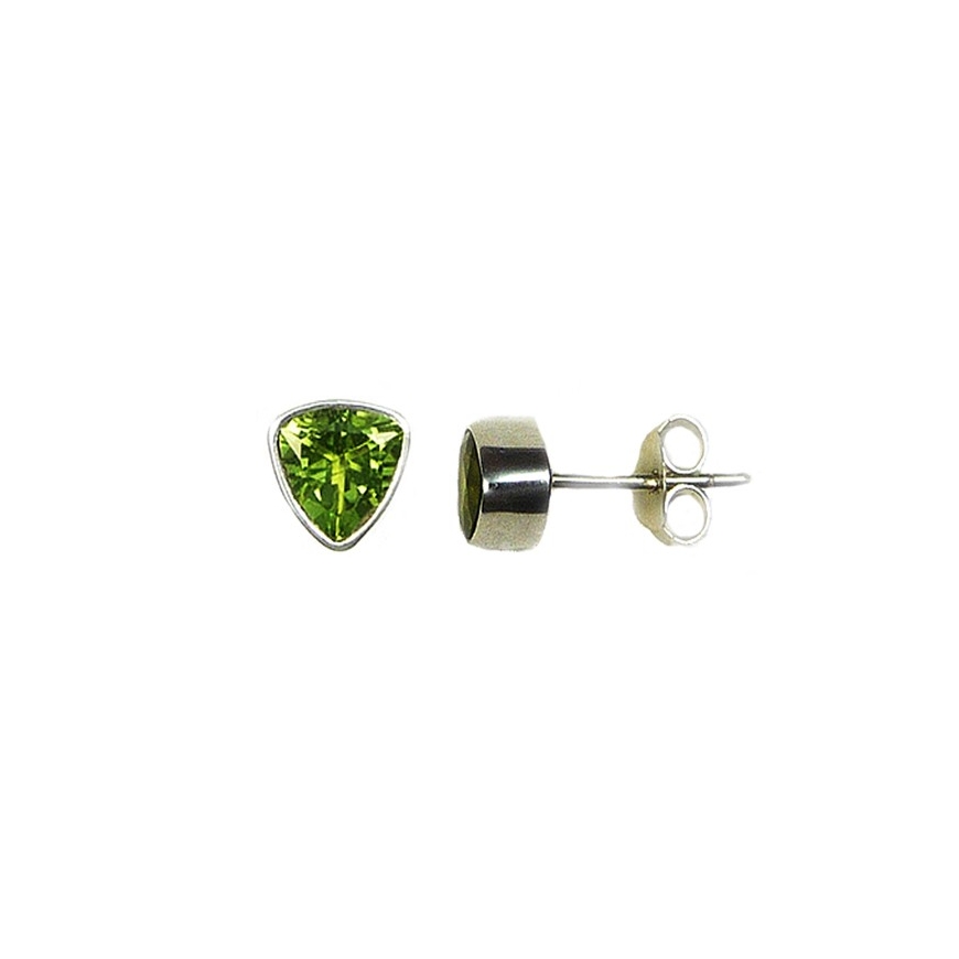 Clous boucles d'oreilles originaux en forme de triangle ou coeurs à offrir pour la Saint Valentin. La monture est en argent massif et les pierres vertes sont des péridots d'un vert tendre et translucide. Faciles à porter ces clous d'oreilles sont discrets.