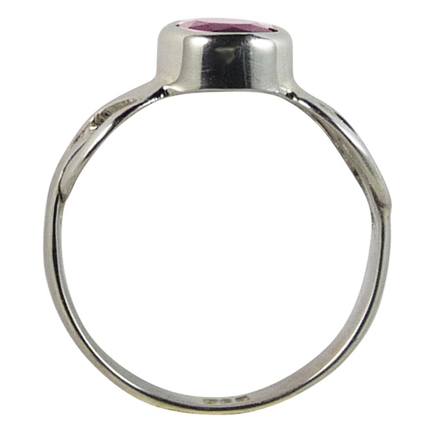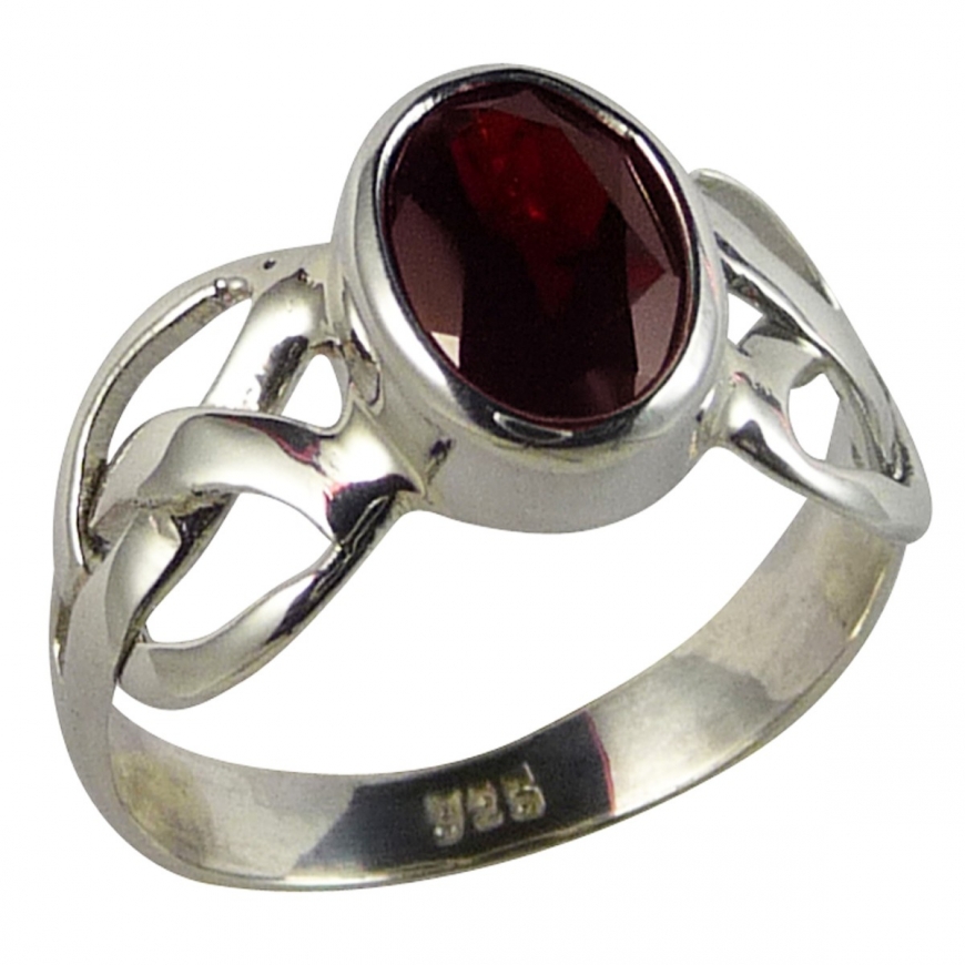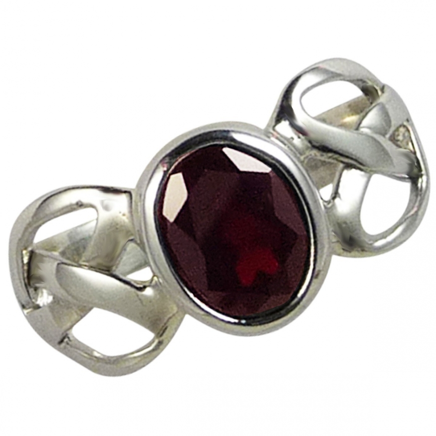 Bague avec un belle pierre de grenat rouge facetté sur une monture en entrelacs d'argent lisse style ethnique, oriental ou Indien. Ces formes aux motifs abstraits font penser aux motifs de l'infini.