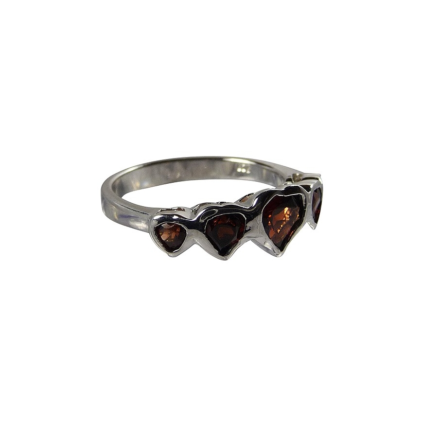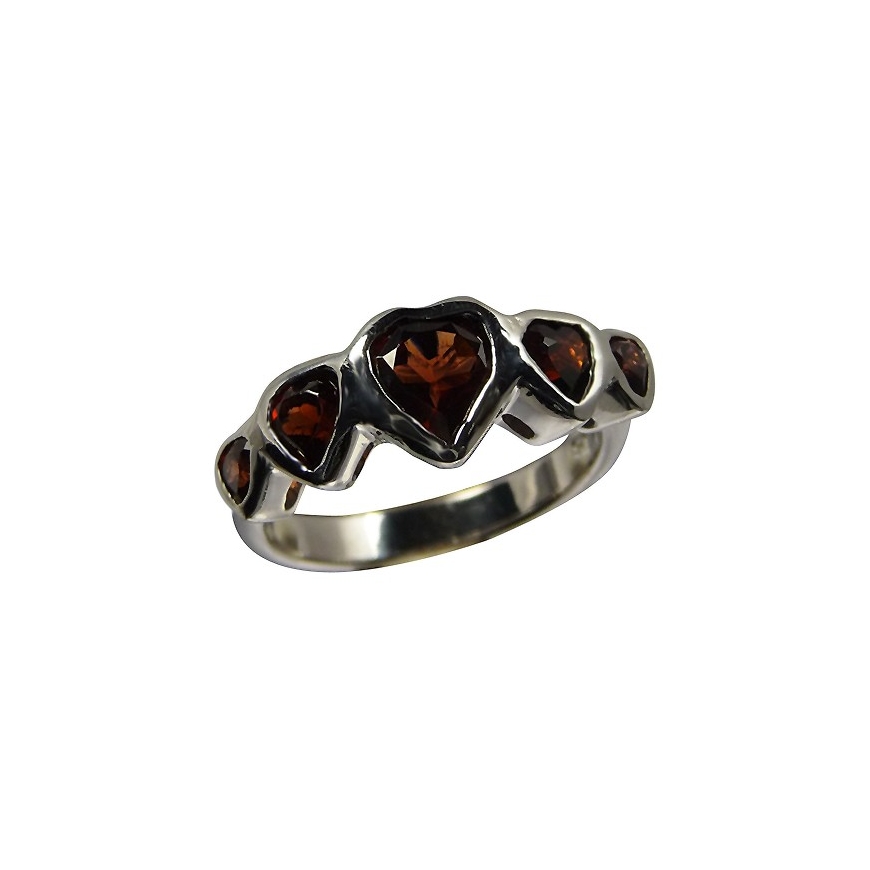 Jolie bague en argent massif avec cinq grenats de différentes tailles en forme de cœur, les pierres sont brillantes et d'un joli rouge. Le grenat est une pierre semi précieuse, elle régule les troubles du cœur, la tension artérielle et la circulation sanguine