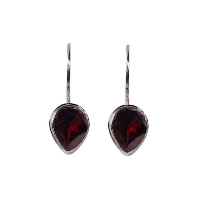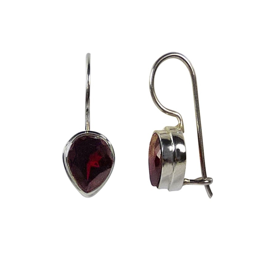 Boucles d'oreilles avec pierre de grenat en forme de coeur ou amande serti dans son écrin d'argent. Ce bijou en grenat est simple facile à porter pour les femmes. Fermeture à crochet argent sécurité