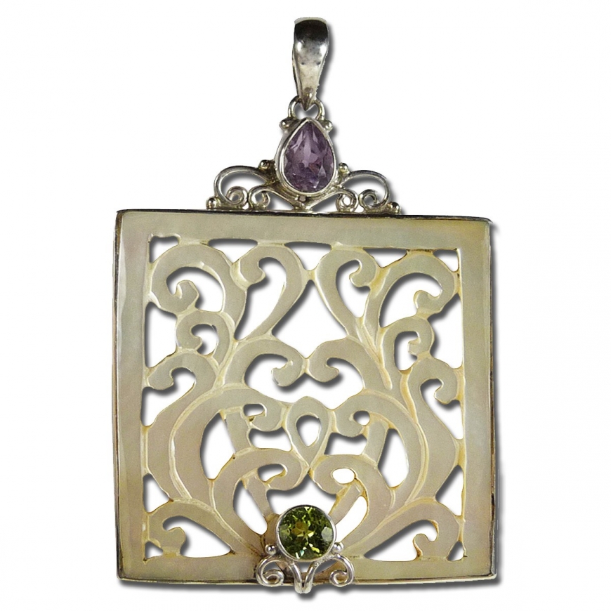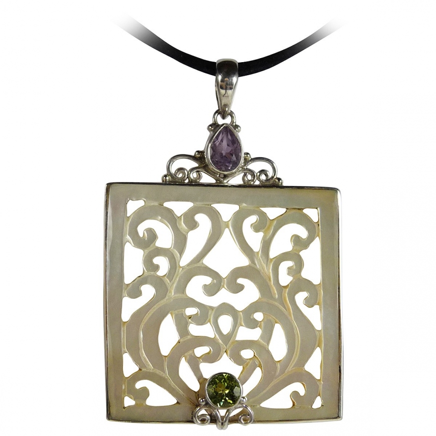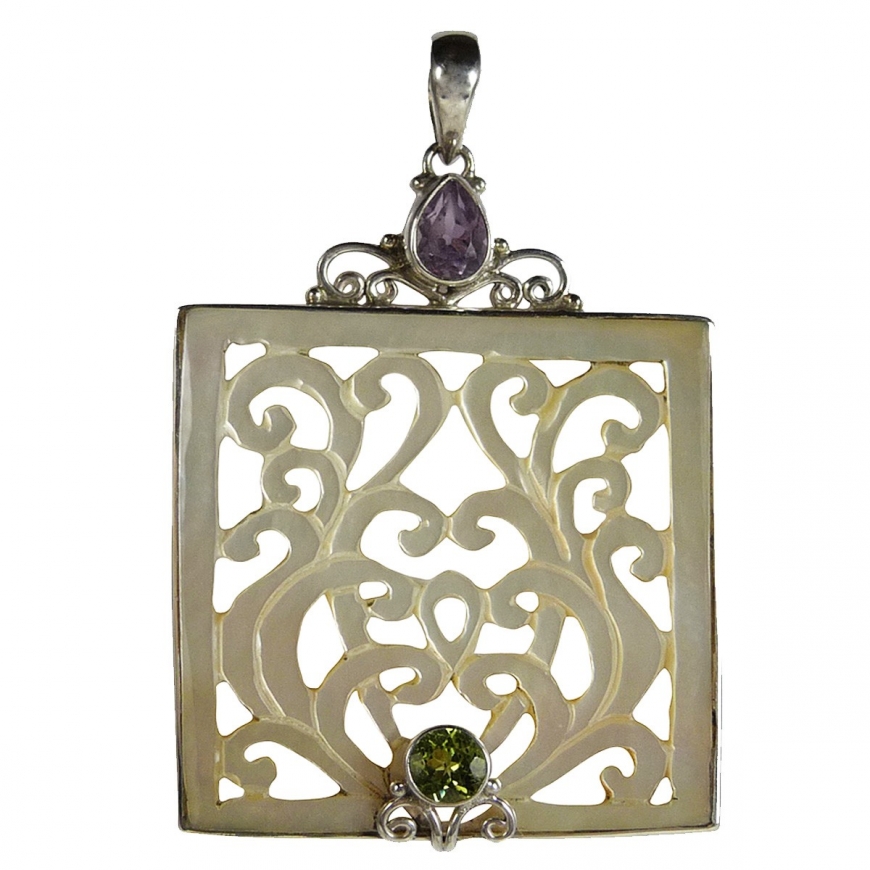 Création artisannale ce bijou et pendentif en nacre est rectangulaire, ciselé, il est embelli par une pierre en améthyste en haut et d'une pierre en péridot en bas. De style oriental ce bijoux vous séduira. Ce pendentif en nacre finement ajouré avec un design floral est légé et élègant pour femme. Pierres fines argent