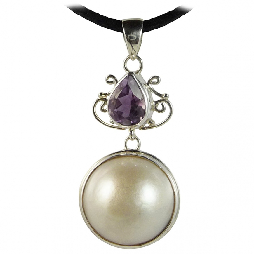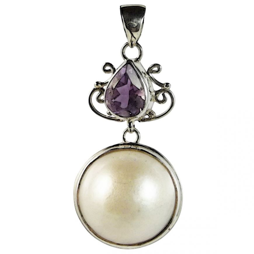 Pendentif baroque avec une association d'une améthyste en forme de goutte facettée et d'une demi boule de nacre ou perle de culture (imitation) mobile, le tout serti avec des fioritures d'argent 925? Ce pendentif est class mais aussi simple. Convient aux femmes et jeune filles.