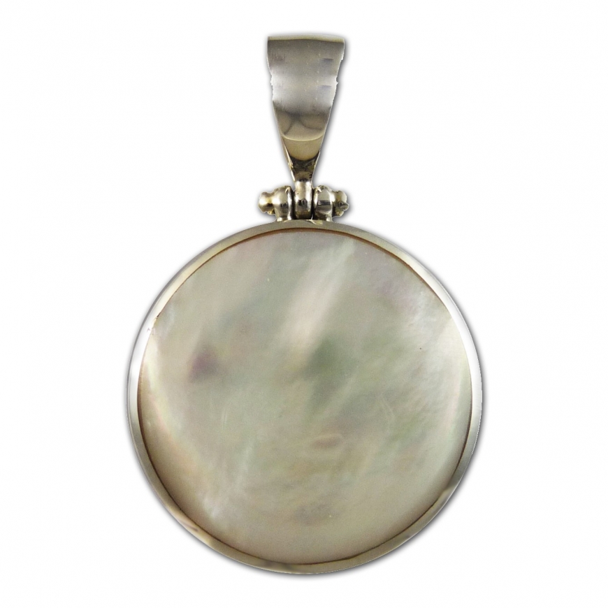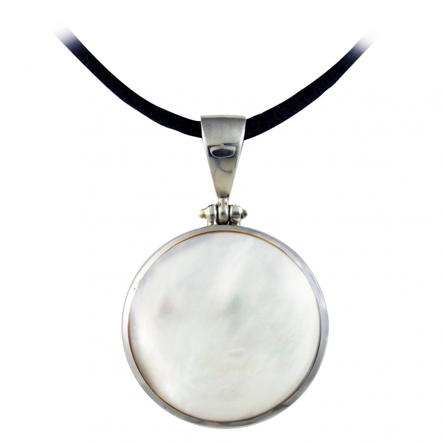 Pendentif rond avec une face en nacre et une face en gorgone. Ce pendentif est monté sur argent 925, de taille moyenne il convient aux femmes élègantes, sont coté super pratique avec deux côtés, fait qu'i se porte du côté blanc ou du côté rouge en fonction de la tenue, il est double usage! Ce pendentif rond est sobre et moderne en même temps.