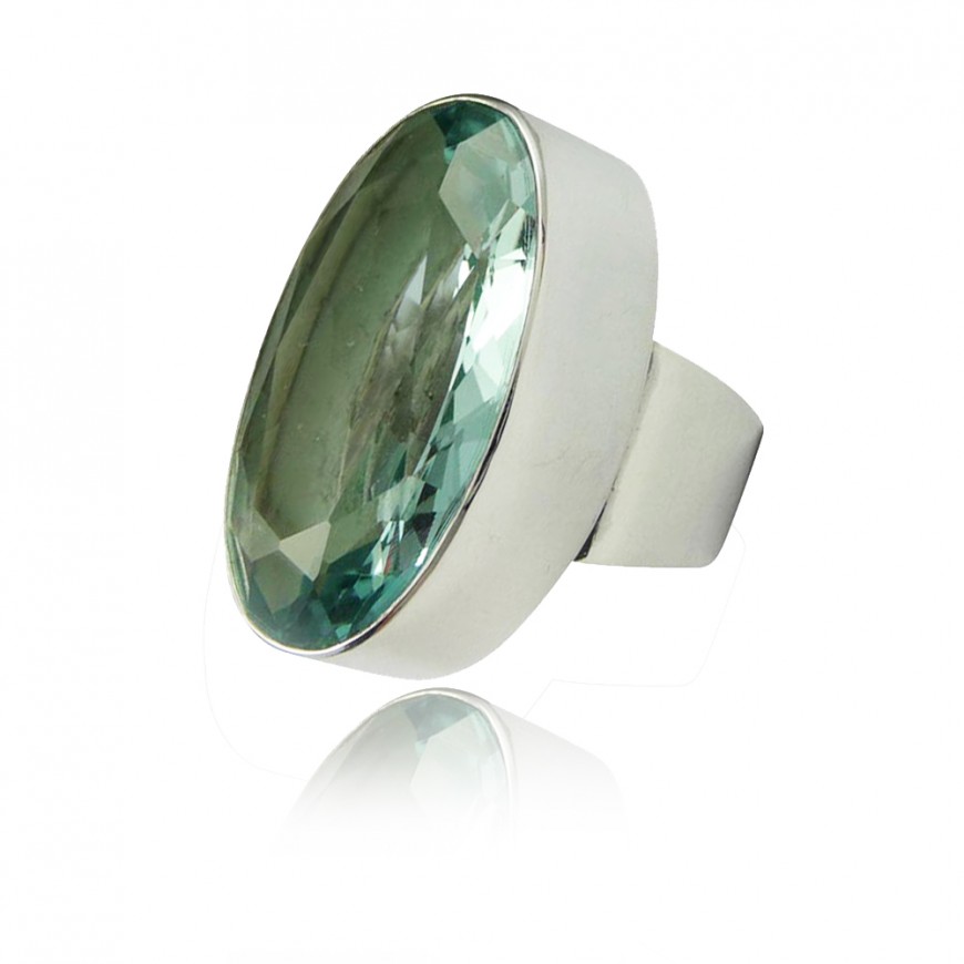 Bague en pierre verte obsidienne, cette bague est taillée en facettes, la coupe de la bague est fine et ovale mais assez grosse voir imposante, la pierre est translucide avec de multiples reflets dans les tons verts et pastels, bijou vert en pierre semi précieuse.