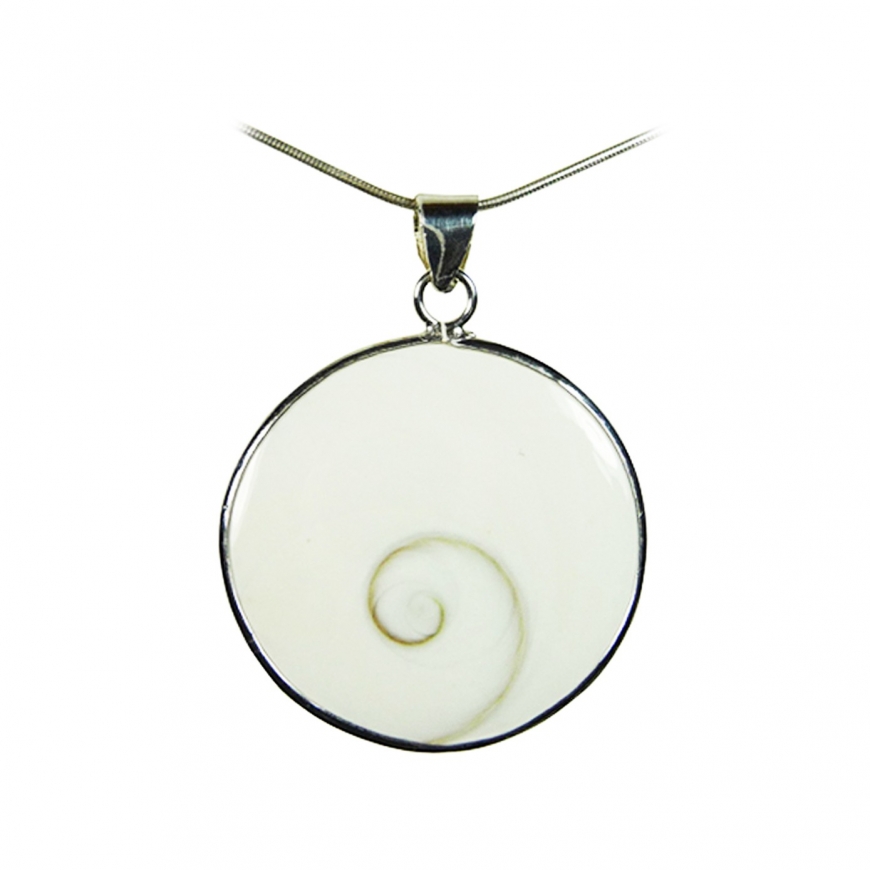 Pendentif rond en œil de Sainte-Lucie. Il se porte facilement en recto/verso. Ce pendentif rond en coquillage blanc est de taille assez grosse. L’oeil de Sainte Lucie est un porte bonheur des marins à l’origine mais il est devenu le porte bonheur de tout le monde, il agirait contre le mauvais œil. C'est un joli coquillage à porter en été ou à l'automne.