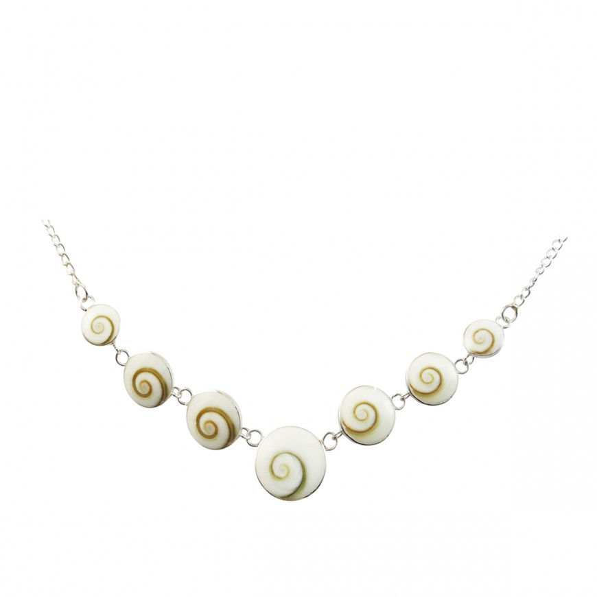 Collier argent sept yeux (oeil) de Sainte-Lucie en forme de ronds. Idéal à porter en été, l’œil de Sainte-Lucie est un porte bonheur du sud. Ce collier ou pendentif est monté sur argent 925/1000, la chaine est de 42 cm plus 3 centimètres de chaine extensible, avec fermoir mousqueton, sept coquillages ronds en tailles dégradées (celui au centre a un diamètre d'1,5 cm et le plus petit 0,6 cm de diamètre)