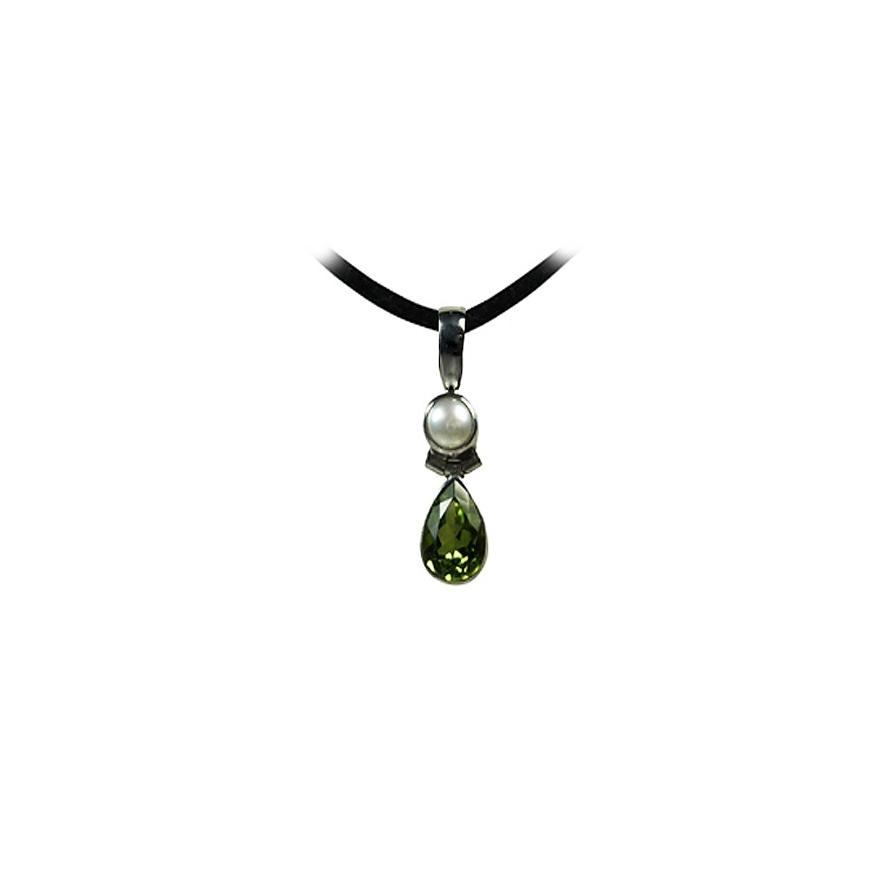 Original petit pendentif alliant une larme de péridot et une petite perle de nacre blanche, le tout serti sur argent lisse. Le péridot est une pierre semi-précieuse verte.