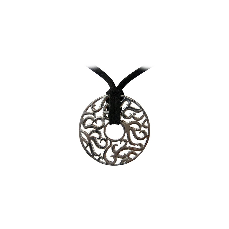 Pendentif femme, disque en argent ajouré avec des arabesques. Médaillon en forme de disque est ravissant porté sur un cordon noir (vendu séparément)