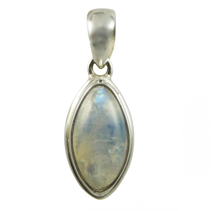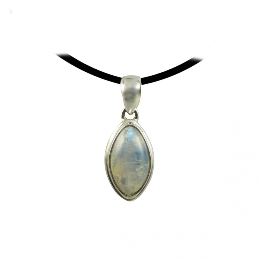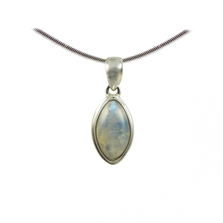 Pendentif en pierre blanche aux reflets bleutés. Cette pierre de lune de dimension moyenne. Pierre de lune arc en ciel ou rainbow, est légèrement striée avec des reflets bleus nacrés, la pierre est taillée en cabochon ovale, la pierre est mise en valeur par un serti argent discret, la pierre est ouverte à l'arrière.