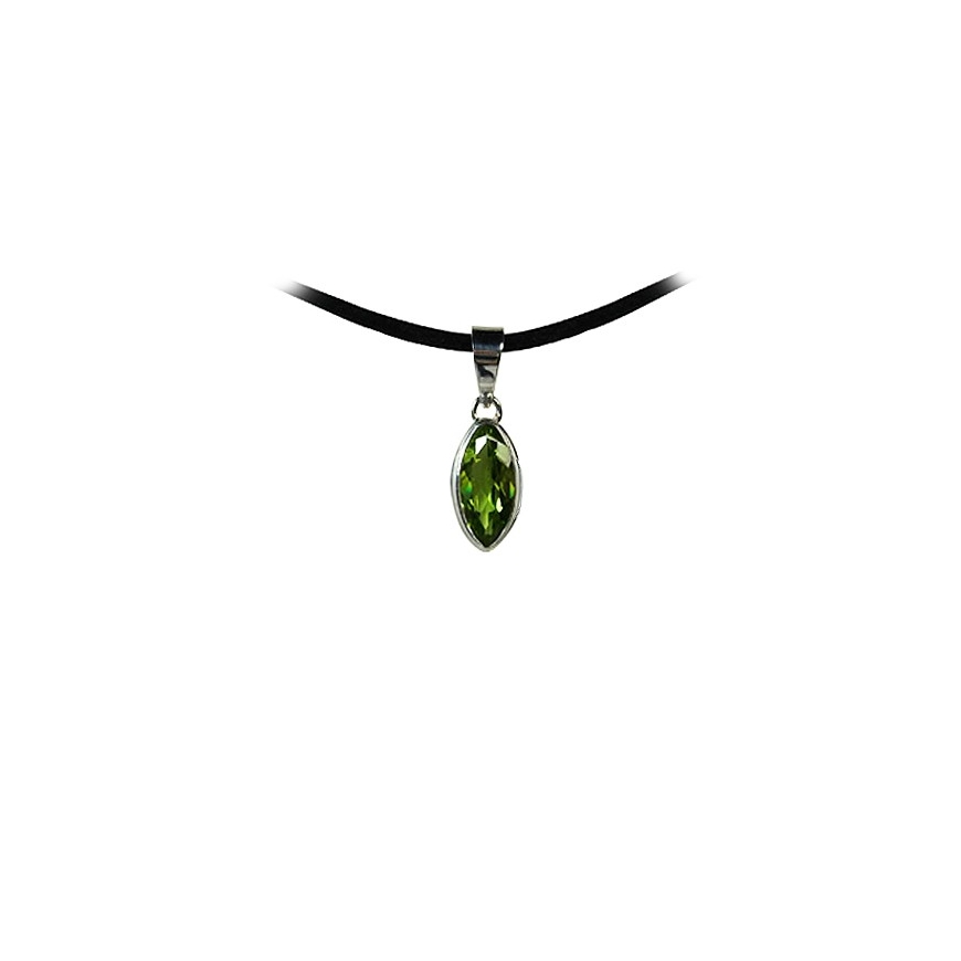 Péridot vert translucide ou pierre en olivine, monté en pendentif sur de l'argent massif. Péridot facetté et taillé en forme de navette, pendentif classique et sobre. Ce petit pendentif est facile à porter de par sa forme simple, il peut être porté avec un cordon en cuir noir (vendu séparément).