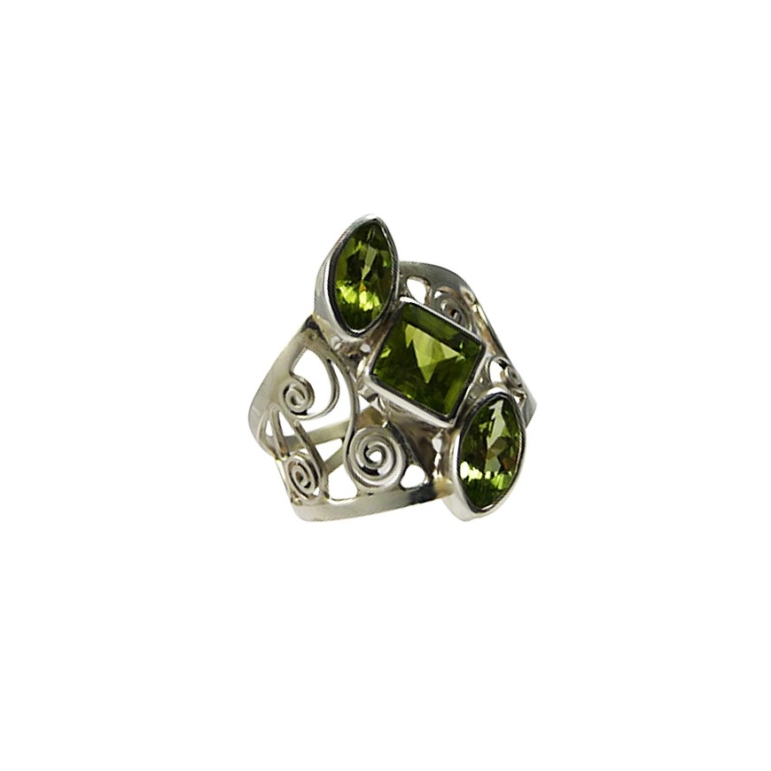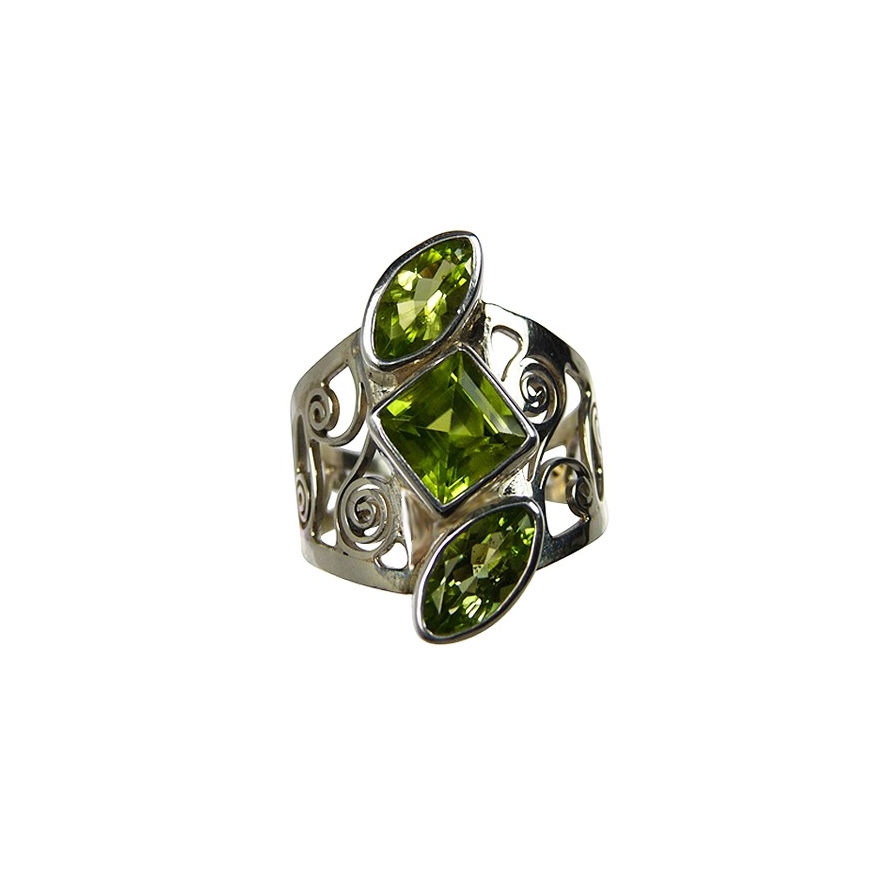 Très belle bague argent avec trois péridots.