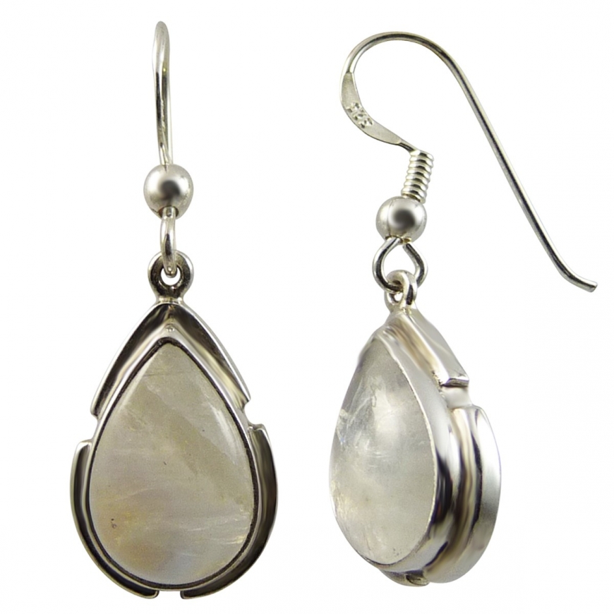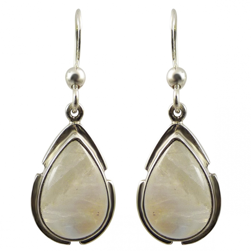 Belles boucles d'oreilles en forme de grosse gouttes de pierre de lune aux reflets irisants. Boucles mobiles, discretes et élègantes. Fermoir à crochet, livrées avec bouchon de silicone.