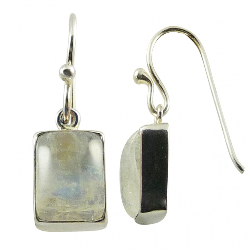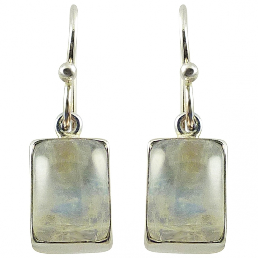 Jolies boucles d'oreilles en pierre de lune de forme carrée. Boucles d'oreilles dormeuses carrées en pierre de lune arc en ciel et argent 925 massif. Bijoux aux reflets bleutés. Fermoir à crochet, livrées avec bouchons en silicone de sécurité.