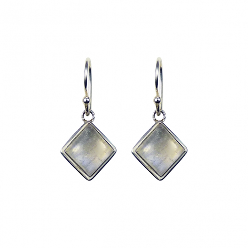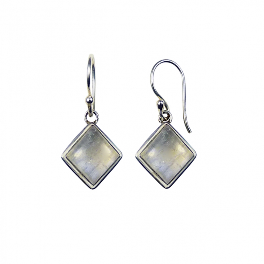 Boucles d'oreilles argent et pierre de lune en forme de losanges avec reflets arc en ciel bleutés, cabochons facettés quatre facettes. Attache crochet avec bouchons de sécurité en silicone, la pierre de lune favorise l’intuition et empathie, chargée d’une énergie réceptive, passive, féminine