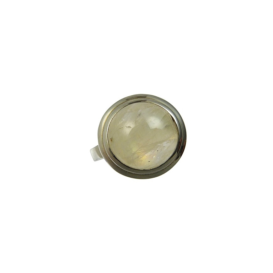 Bague en argent lisse, montée avec un cabochon en pierre de lune rainbow, cette pierre a un aspect laiteux, et des reflets bleutés avec parfois tout le spectre des couleurs réunis dans une même pierre. monture à double anneaux.