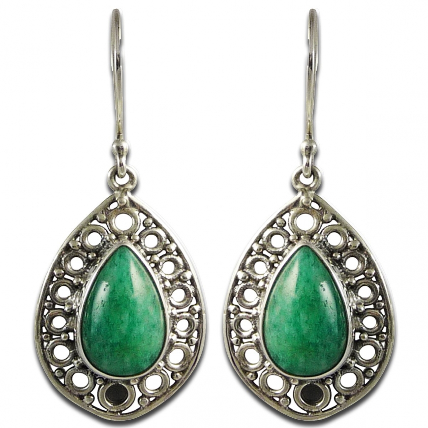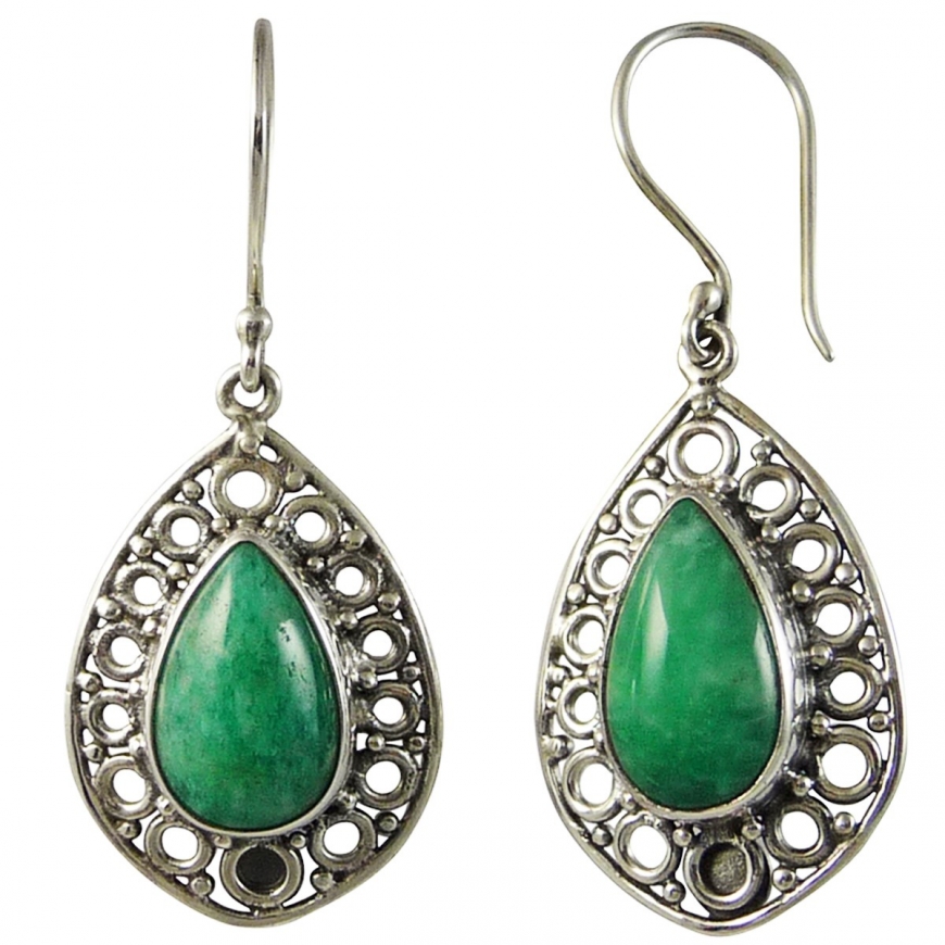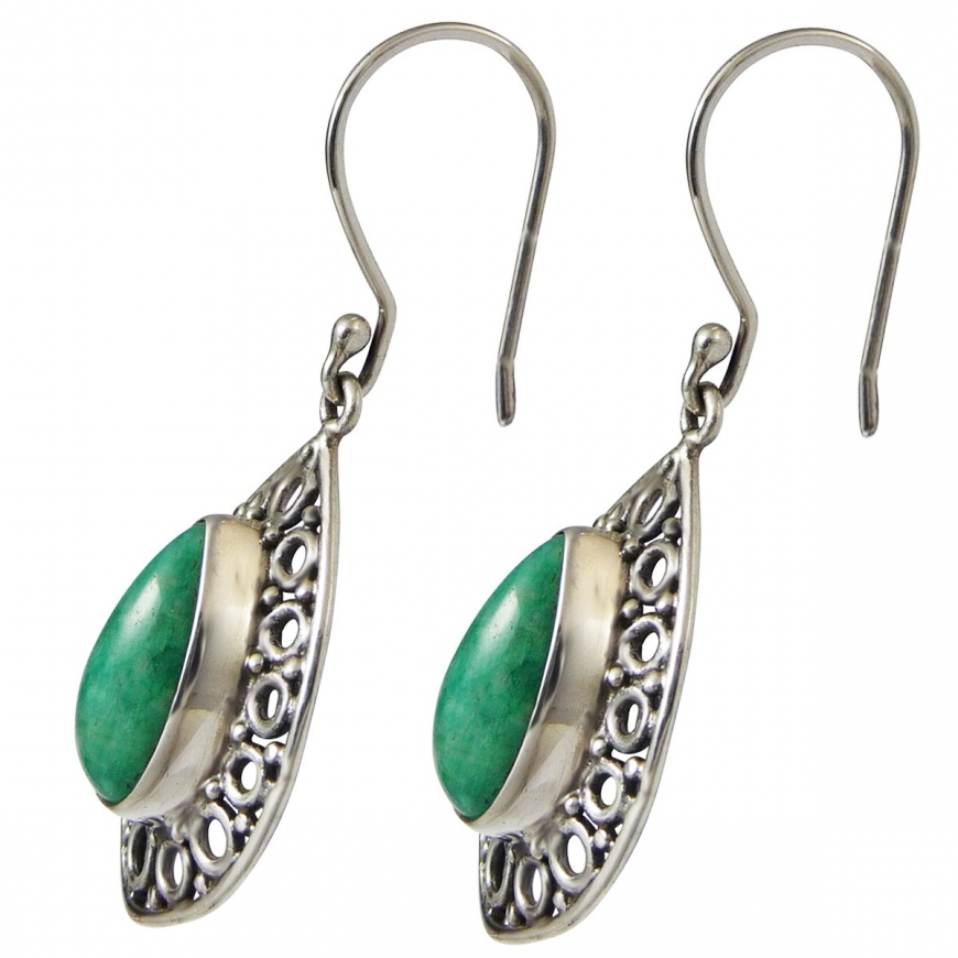 Boucles d'oreilles en Amazonite sertie dans une couronne d'argent travaillée de style oriental et ajouré. Les pierres en amazonite verte pales sont en forme d'amande et taillées en cabochon. Fermoir à crochet, livrées avec bouchons de sécurité en silicone