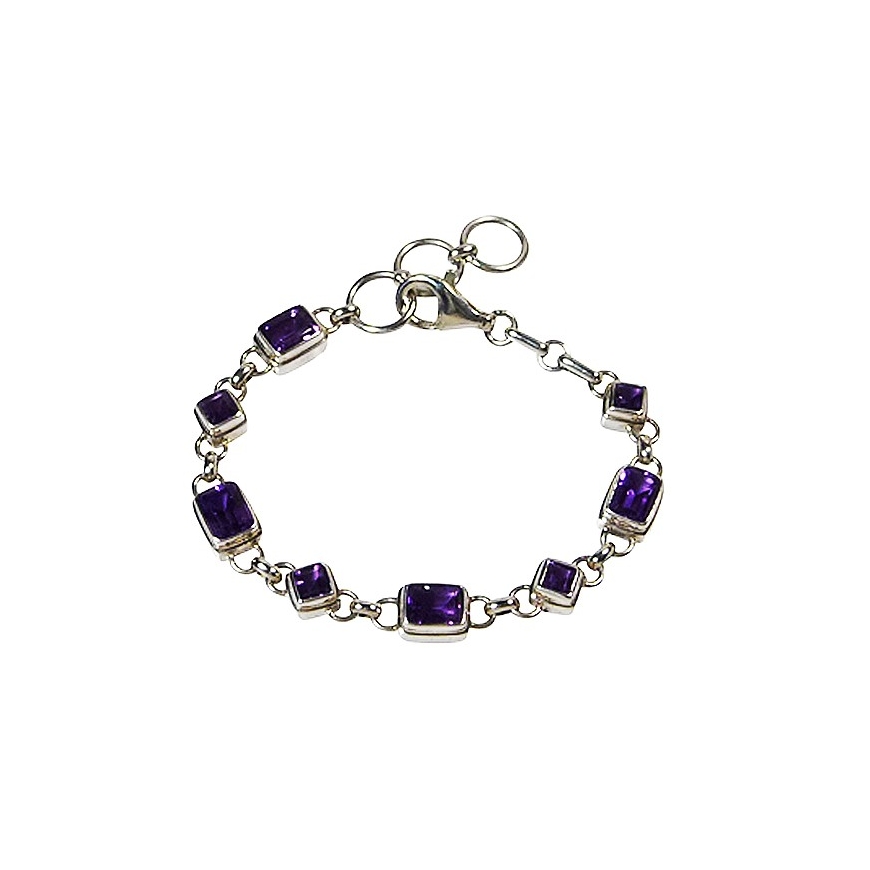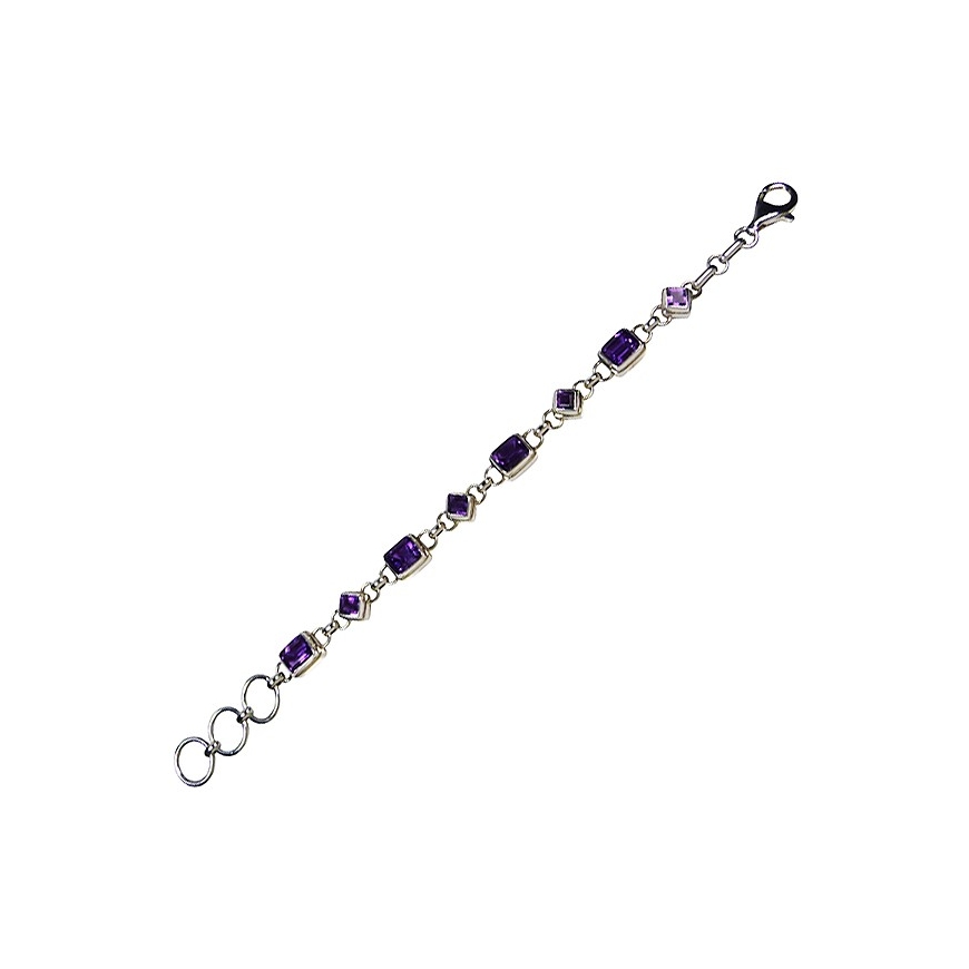 Très beau bracelet en améthyste avec alternance de pierres violettes en forme de rectangle et losange facettés. Les améthystes sont reliées par de petites mailles en argent. Bracelet argent réglable de 17 cm à 20 cm par un mousqueton de sécurité.