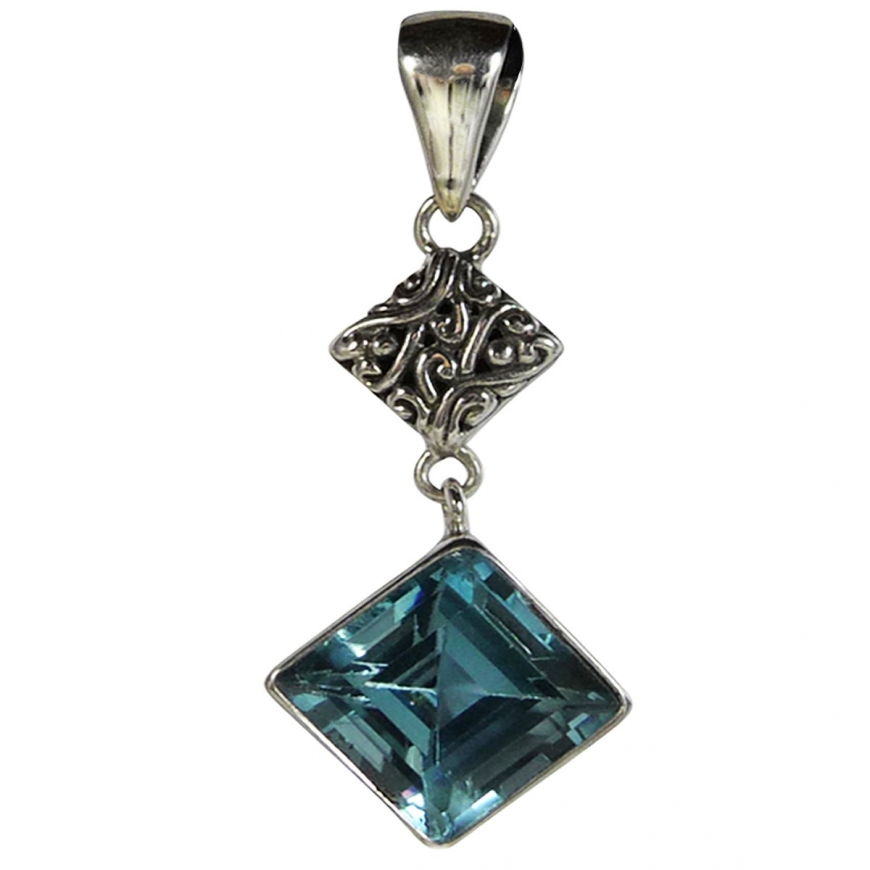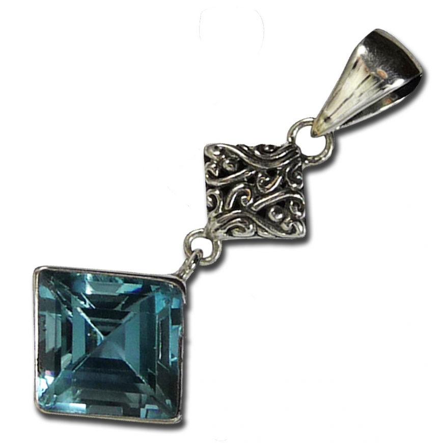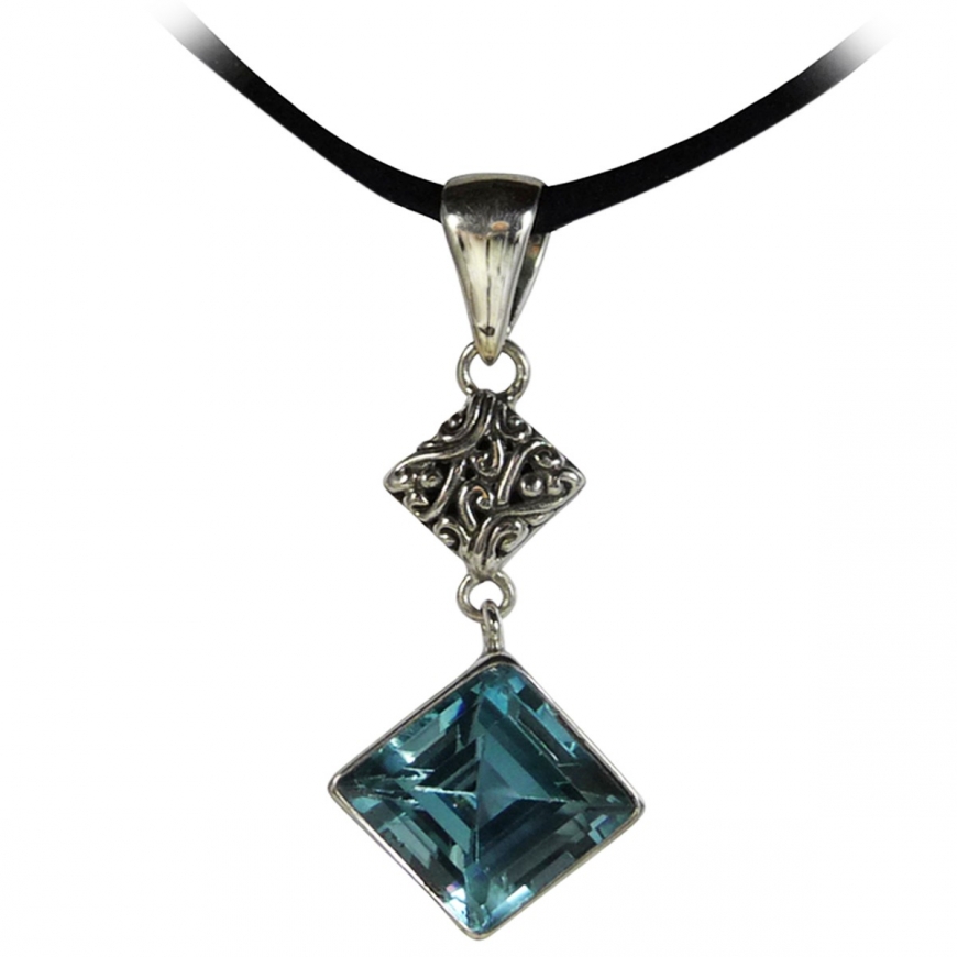 Joli pendentif au design ethnique avec une belle topaze bleue facettée et une bélière en argent travaillé. Ce pendentif est un double losange un en argent travaillé et l'autre en pierre bleue une belle topaze facettée. Elégant ce pendentif est très fin et mobile, pour femme.