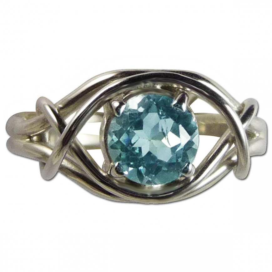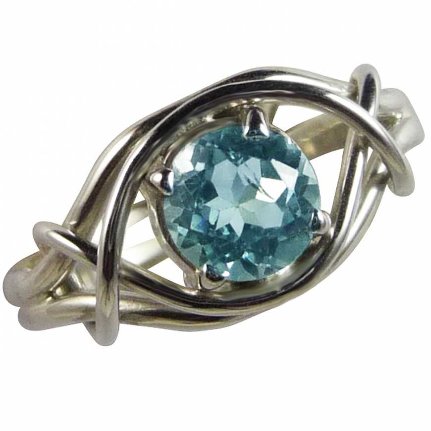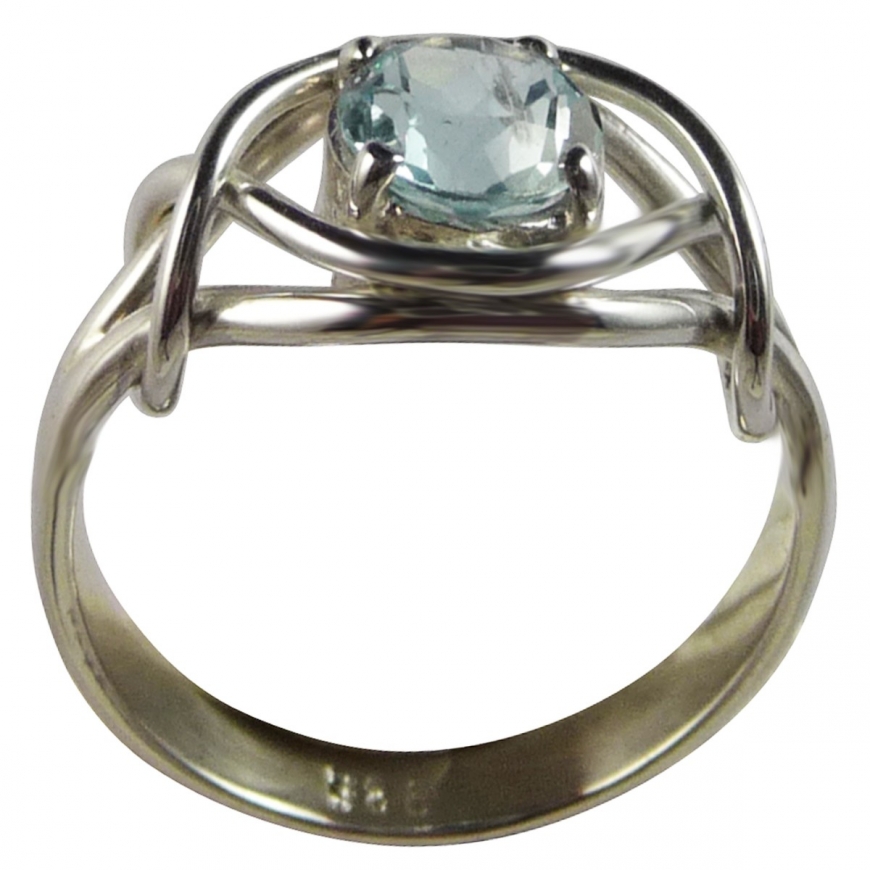 Jolie petite topaze bleue facettée et sertie dans des griffes d'argent et un entrelac infini de fil d'argent. Cette bague est petite mignonne et moderne. Lapierre bleue est une topaze une jolie pierre semi précieuse, pour femme et jeune fille!