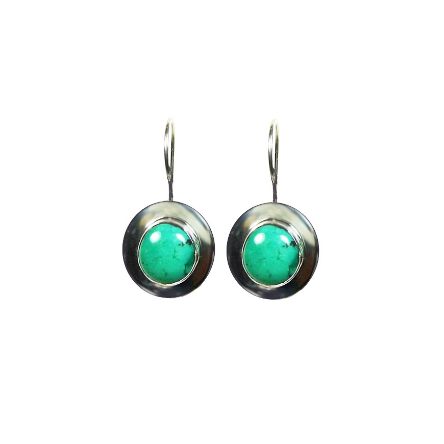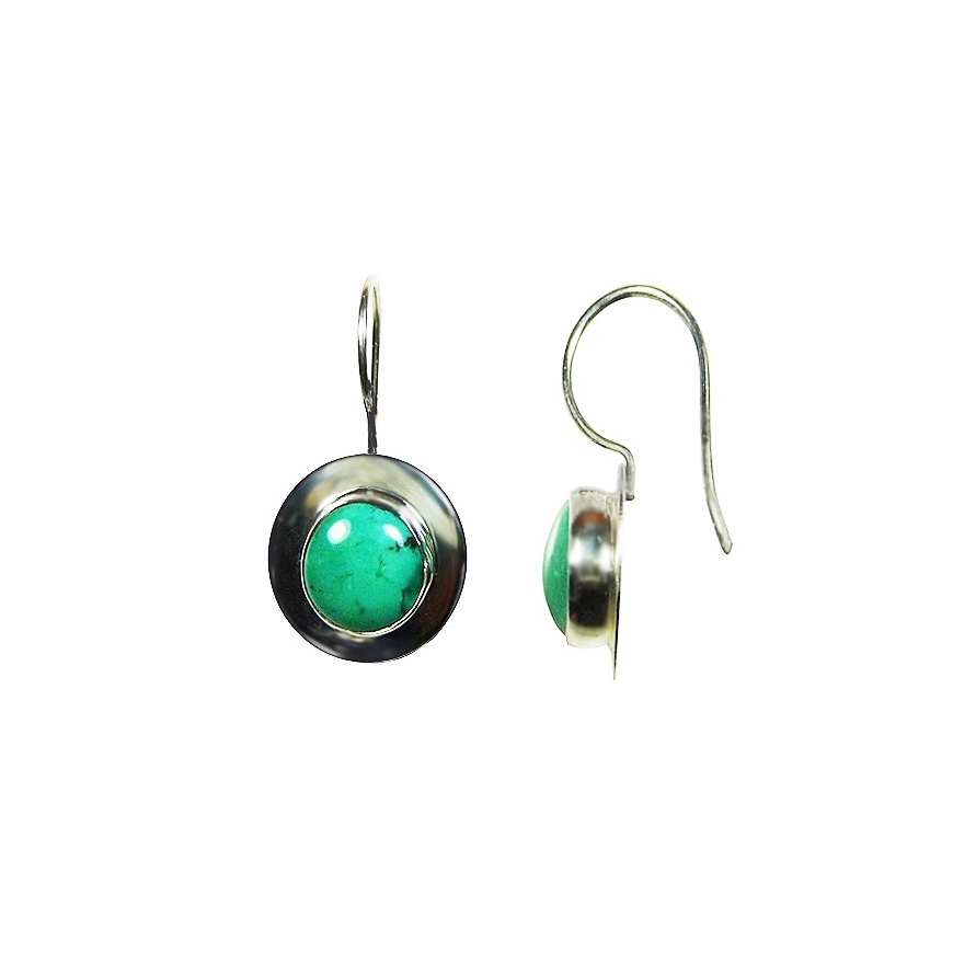 Ces boucles d'oreilles en forme de dormeuse sont en argent et turquoises rondes, elles sont serties d'un tour d'argent lisse, elles sont légères et agréables à porter. Livrées avec bouchons en silicone autobloquants.