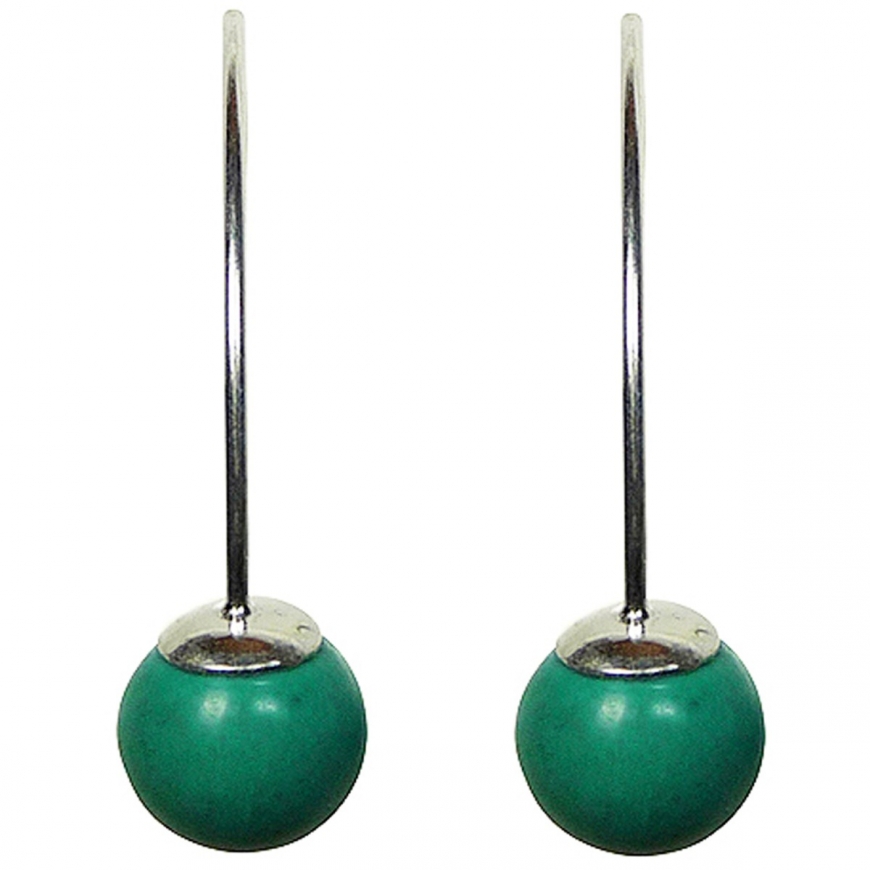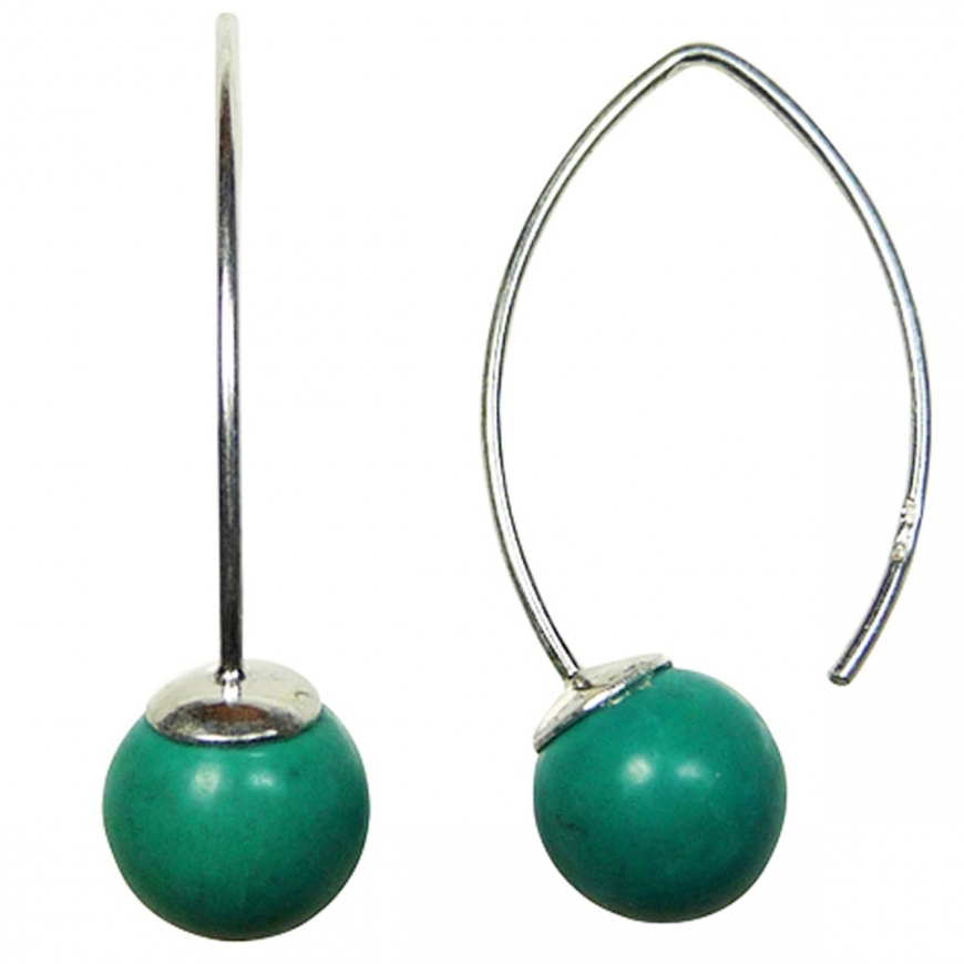 Boucles d'oreilles avec une longue tige fine en argent et boule en argent au bout, la boule est en turquoise reconstituée elle est de taille moyenne. Ces boucles sont modernes et légères. Livrées avec bouchons en silicone autobloquants.