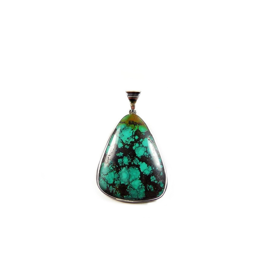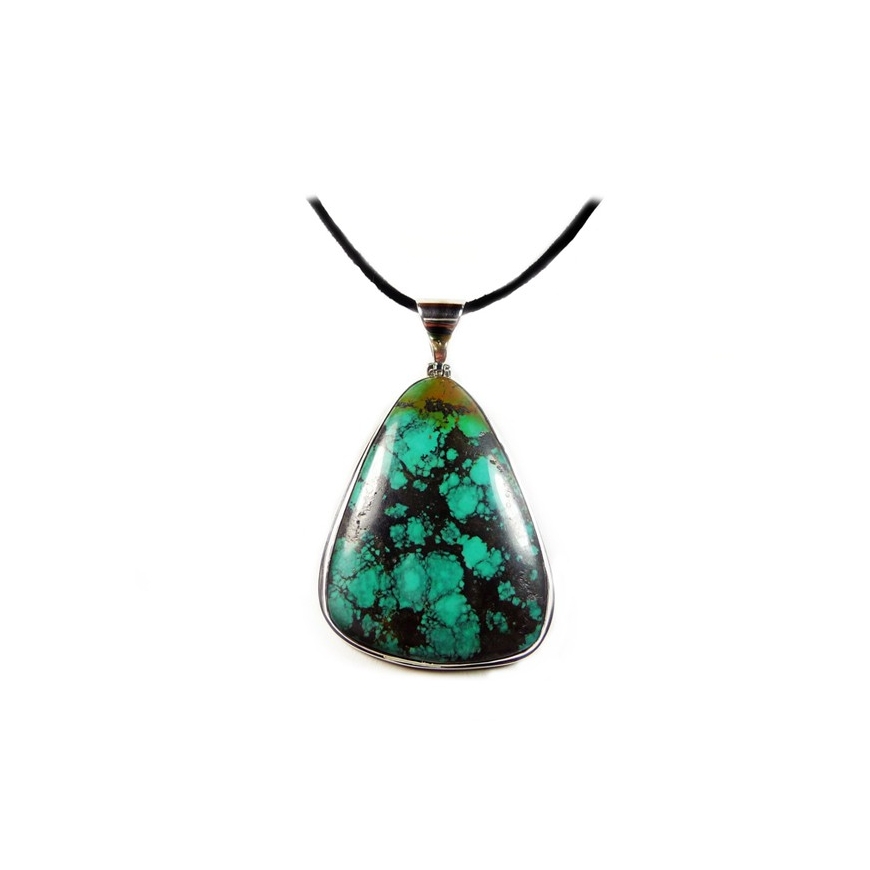 Gros pendentif de turquoise en forme de losange asymétrique. Cette pièce unique est à porter de préférence sur le plexus solaire, La turquoise accroît l’intuition et la méditation. A porter sur un cordon ou une chaine (vendus séparément)